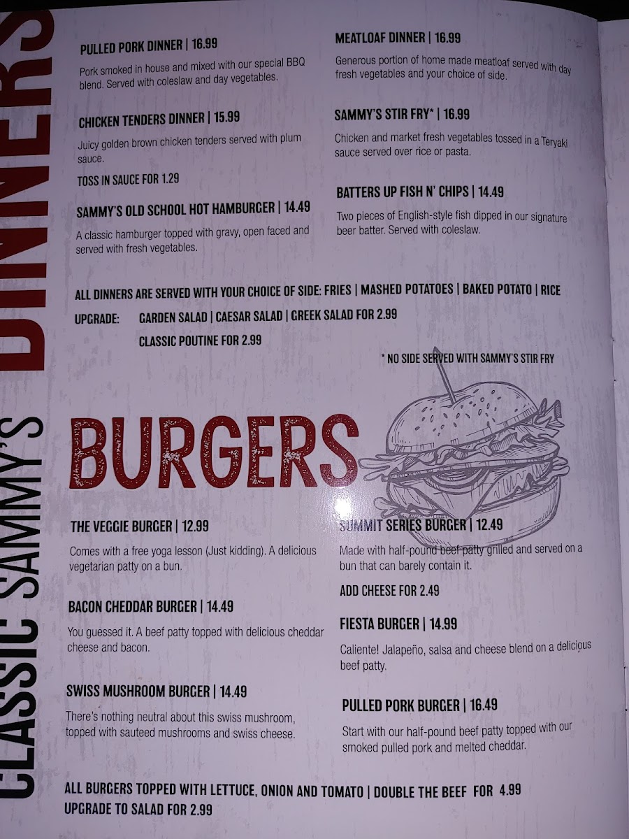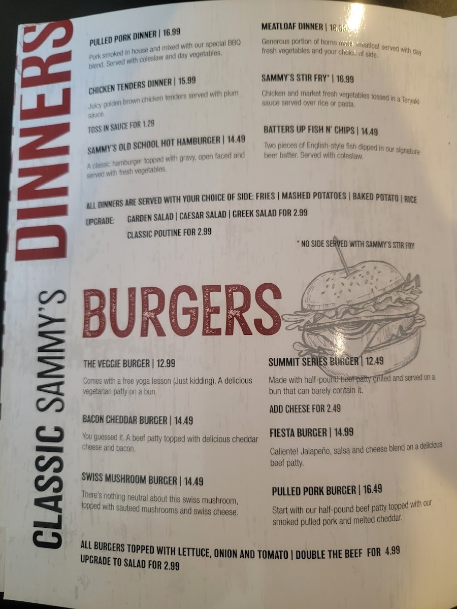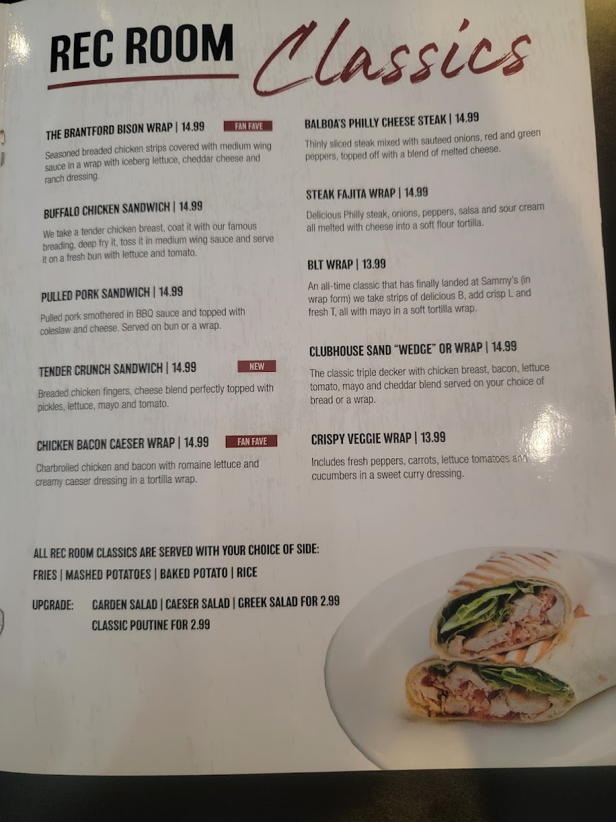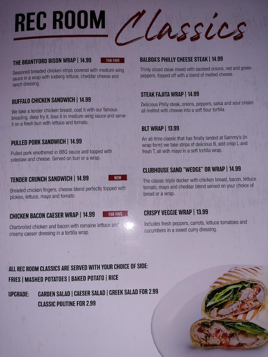 Welcome to Sammy's Rec Room, a cozy neighborhood gem located at 10 Mt Pleasant St, Brantford. This inviting spot is perfect for indulging in delicious fare while enjoying a lively atmosphere. The menu features a tantalizing array of options, including the mouthwatering Tender Crunch Sandwich and the rich Jumbo Butter Tart. For burger lovers, the Swiss Mushroom Burger and the Pulled Pork Burger are sure to impress.
